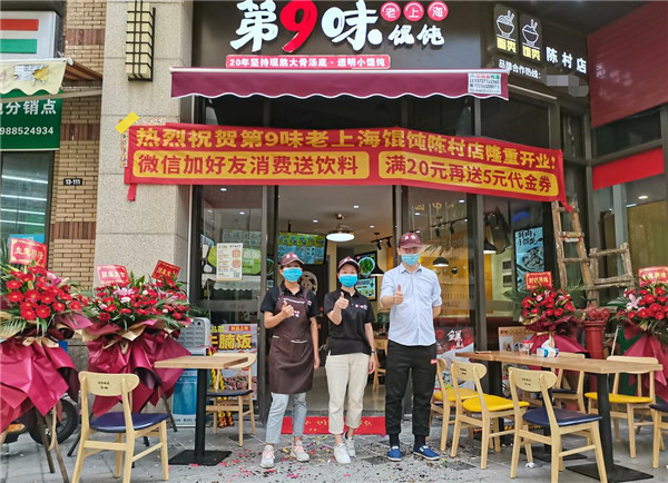 第9味老上海馄饨海南大英村店、水榭丹堤店、广佛陈村店开业当天,店外花篮林木,锣鼓喧天,店内生意火爆,人头躜动,看到这样的盛况,全体第9味人感到由衷的喜悦。